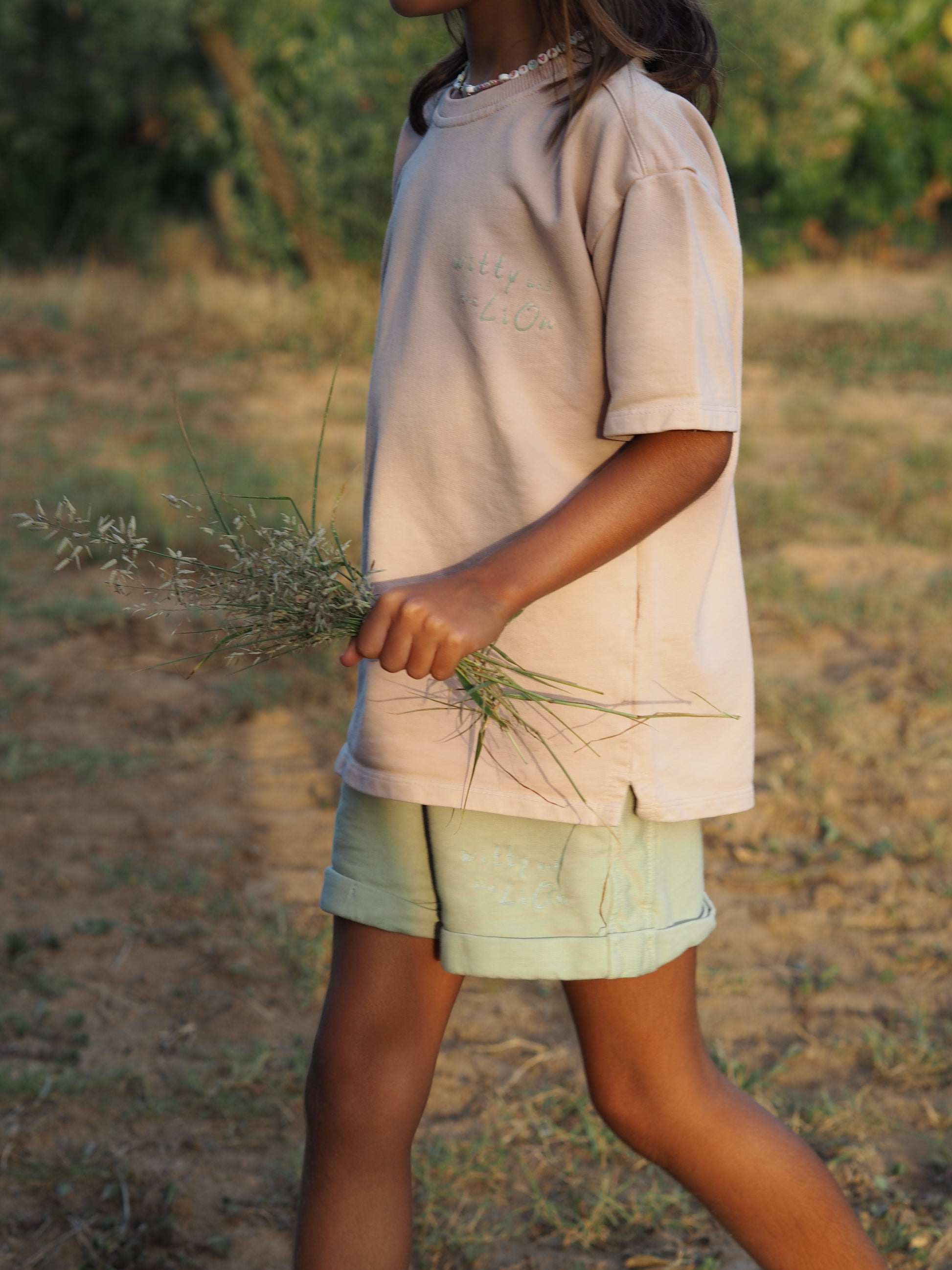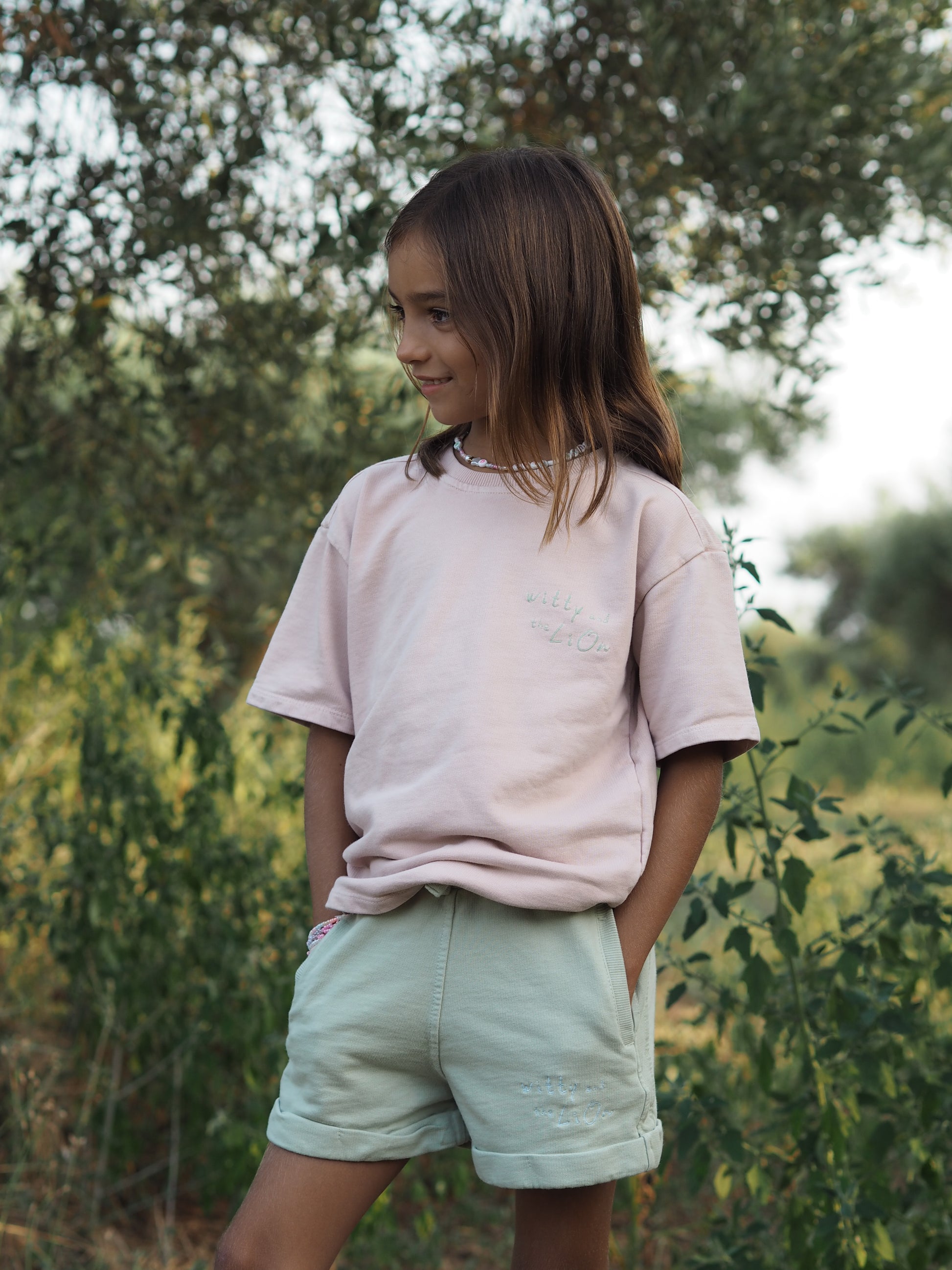 Pantalón corto de punto color verde, bajo con dobladillo. Logo bordado en azul en la parte delantera de la pernera.